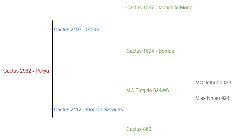 Poliya es sangre abierta. Por el lado de la madre, la 2112 tiene a Elegido y Zacarías, uno de los Angus con mejor producción de la historia. Elegido, por su parte, le aportó clase y femineidad. Donante muy correcta, femenina, con mucha clase y con muy buenos cuartos traseros. Es la madre de Cóndor, Gran Campeón de la Exposición del Chaco 2023.
