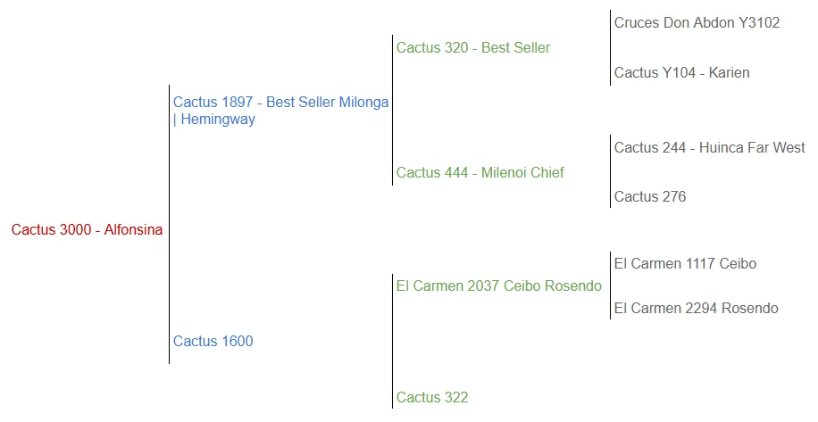 Alfonsina es la mejor donante de Cabaña El Destino. Es una madre con clase, gran blandura de engorde, moderada y con notable consistencia genética. Hija de Hemingway, toro Brangus que marcó un antes y un después en el Brangus colorado, y nieta de Cardenal, otro referente histórico de la variedad. Es madre de Hipólita, multicampeona en exposiciones y destacada donante, y de Red Dollar, toro padre con la mejor estructura y proyección dentro de la raza.