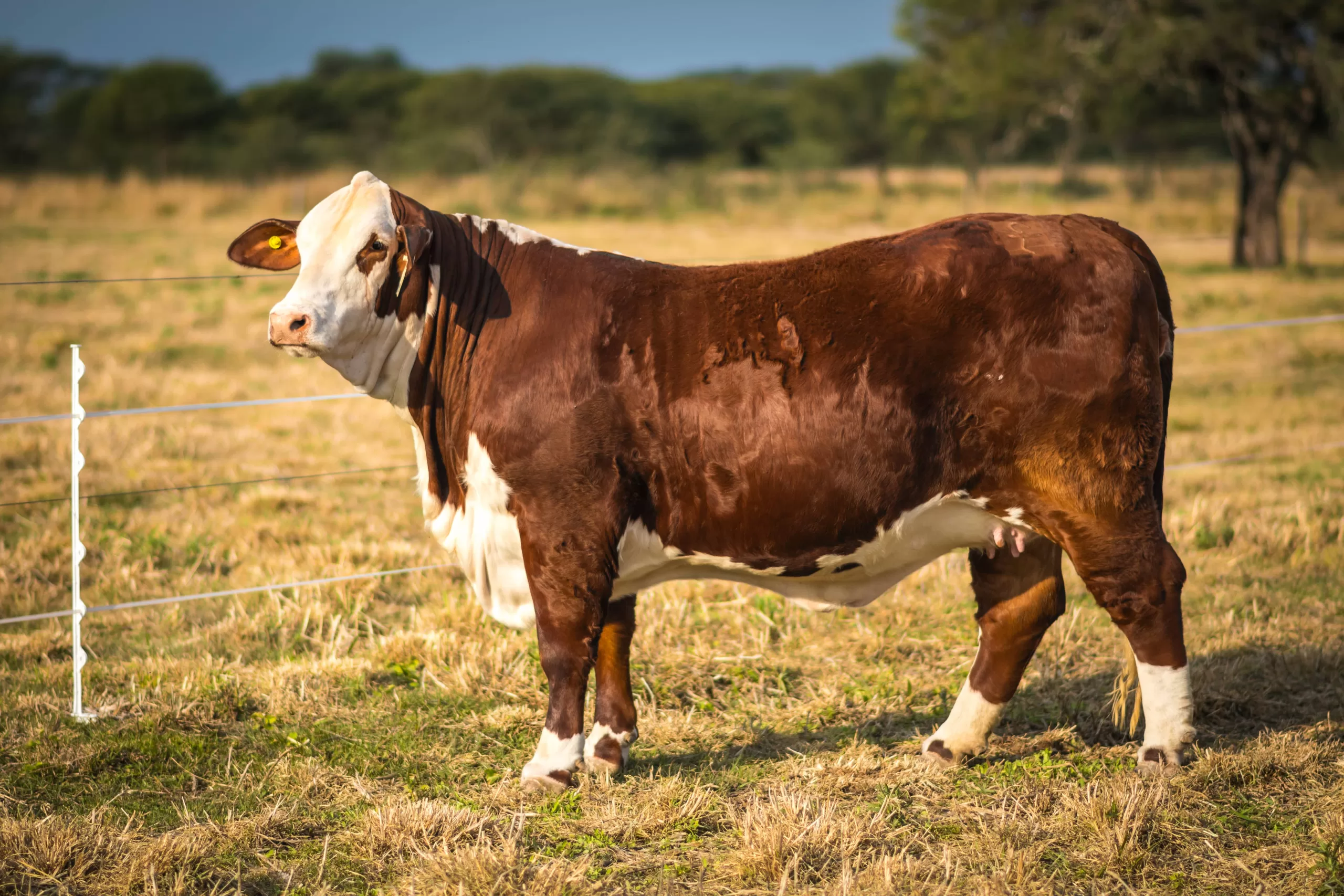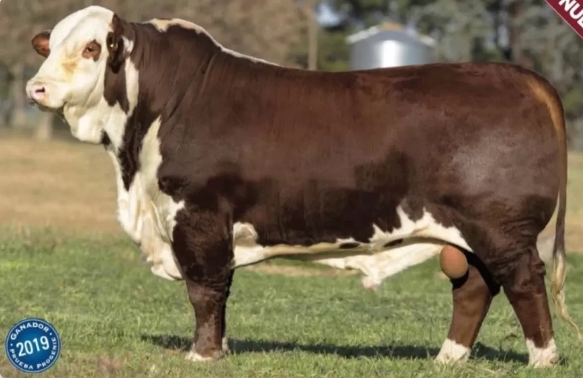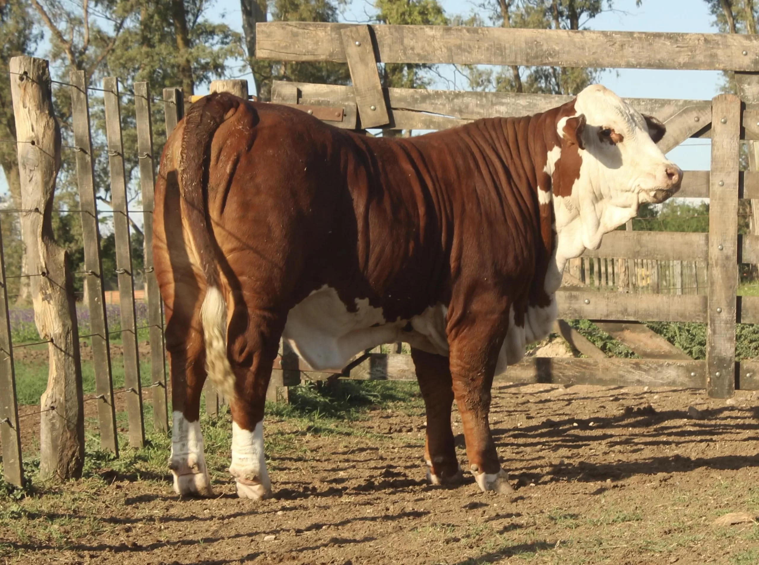 Es mocho, posee una impresionante masa muscular con cuartos traseros bien descendidos, muy largo y de una excelente línea de lomo.