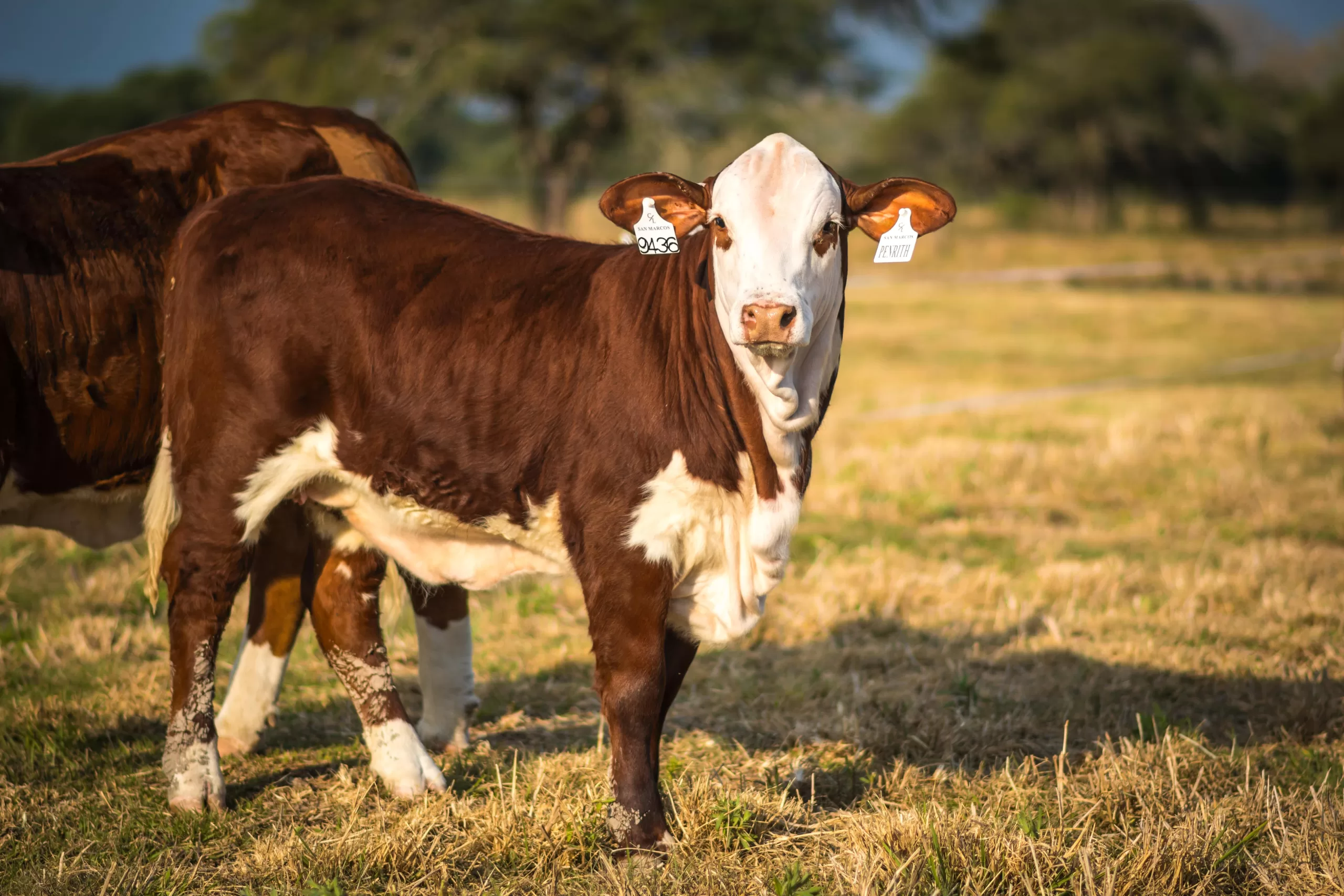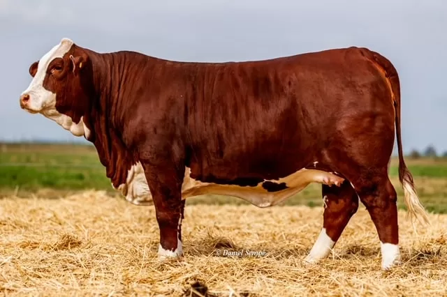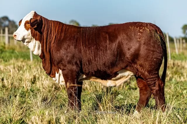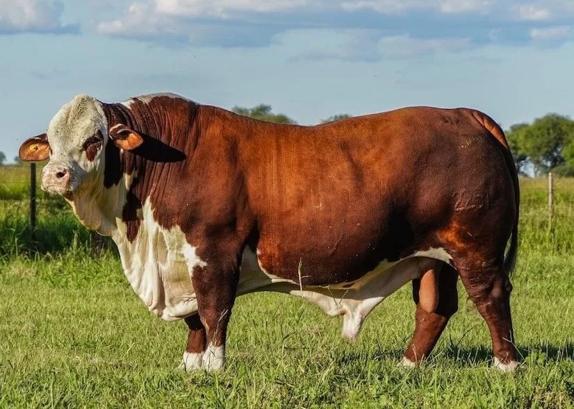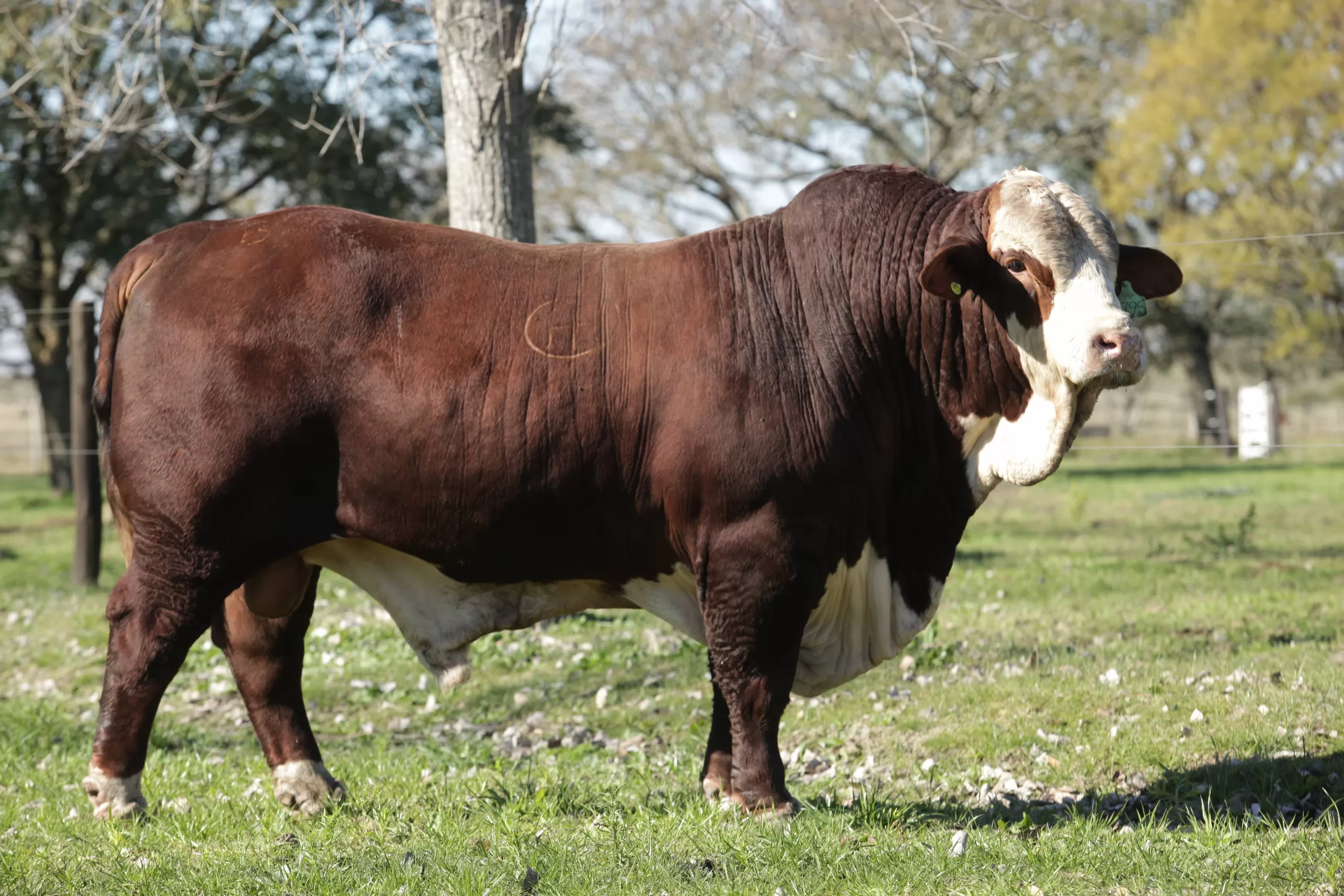 Es mocho, posee una impresionante masa muscular con cuartos traseros bien descendidos, muy largo y de una excelente línea de lomo.